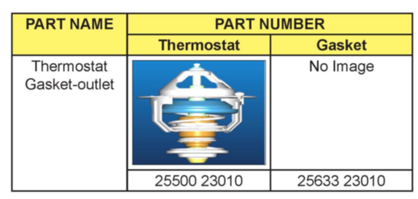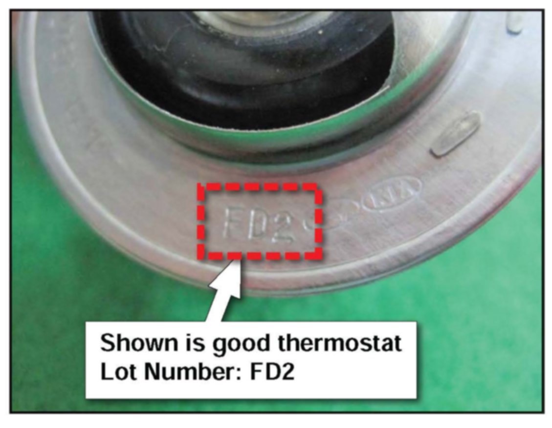 This bulletin provides information relating to some SOUL (AM) vehicles with 2.0L engines built between January 14, 2010 ~ February 27, 2010 which may exhibit the MIL (Malfunction Indicator Lamp) illumination with DTC P0128 stored in memory. During this time period manufacturing equipment may have affected the performance of the thermostat. An inspection and/or replacement of the thermostat will be necessary. First the lot number is checked on the thermostat and if identified as defective replacement will be necessary.