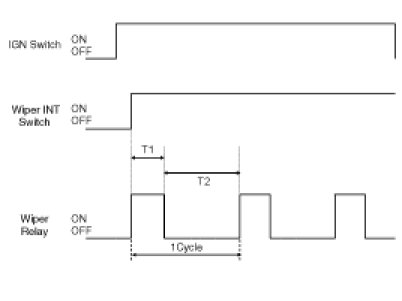 (1) Turn Wiper switch ON after T1 when turning Washer switch on at the status of IGN2 ON and if the input of Washer switch is between 0.06 and 0.2sec, turn the output of Wiper relay OFF after T3. But, ignore the input the input of Washer switch after operating Washer interlocking wiper.