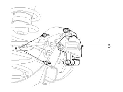 4. Remove the brake caliper mounting bolts (A), and then place the brake caliper assembly (B) with wire as shown in the illustration.