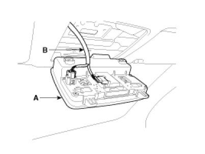 3. Disconnect the sunroof switch and lamp connector(B) and then remove the overhead console lamp(A).