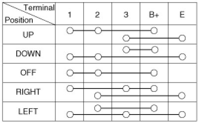 2. Apply battery voltage to each terminal as shown in the table and verify that the mirror operates properly.