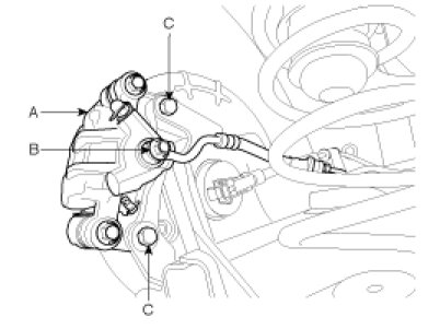 2. Loosen the hose eye-bolt (B) and caliper mounting bolts (C), then remove the rear caliper assembly (A).