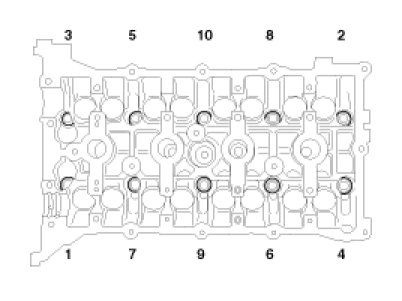 (1) Using triple square wrench, uniformly loosen and remove the 10 cylinder head bolts, in several passes, in the sequence shown. Remove the 10 cylinder head bolts and plate washers.