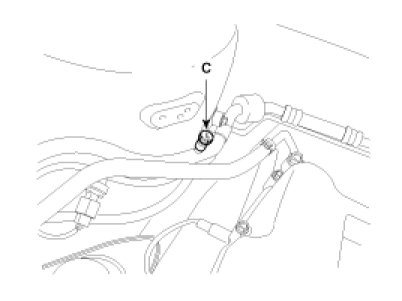 2. Connect an R-134a refrigerant Recovery/Recycling/Charging System (A) to the high-pressure service port (B) and the low-pressure service port (C) as shown, following the equipment manufacturer's instructions.