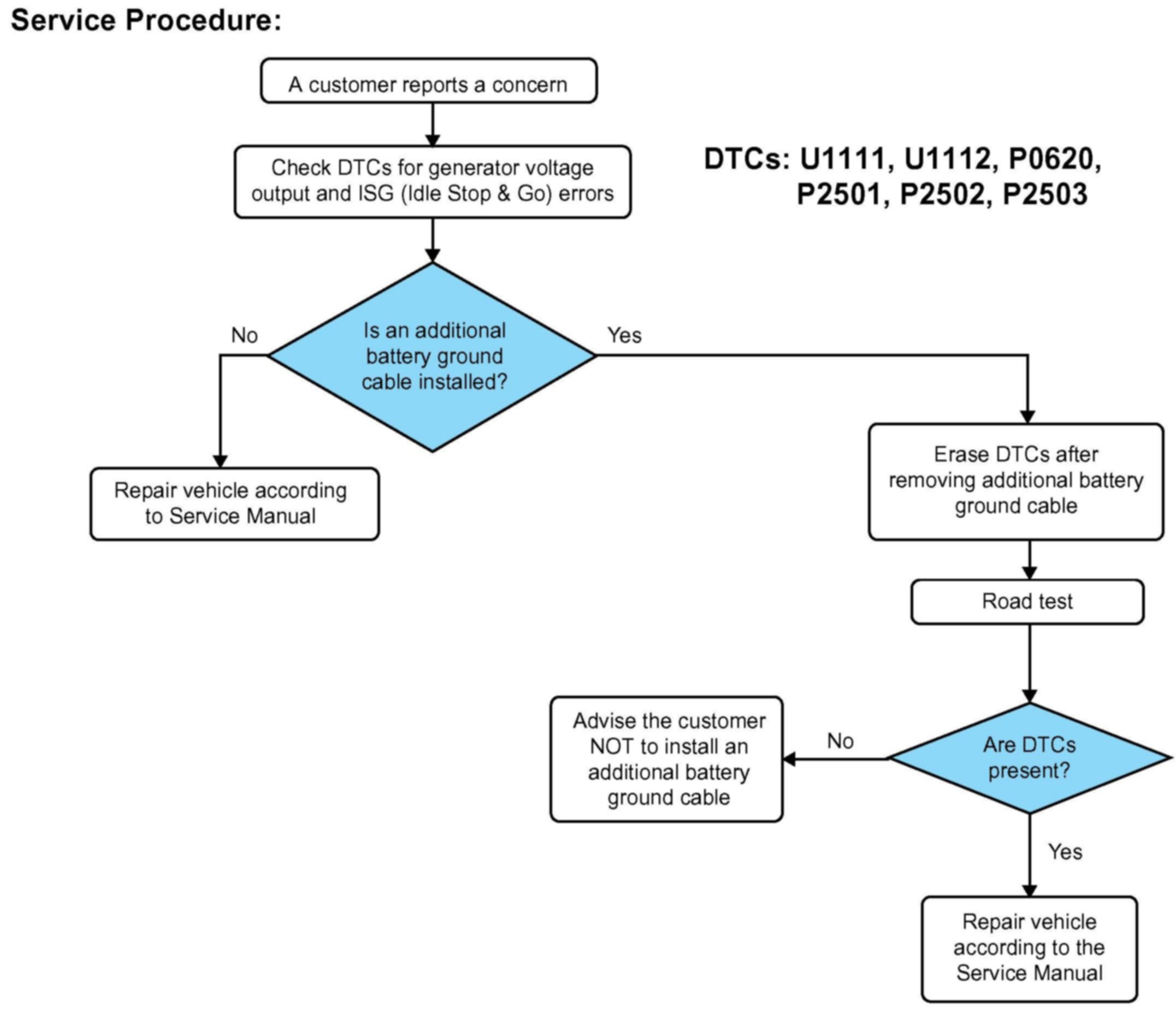 If an additional ground cable is installed on the battery (-) terminal, the battery sensor may incorrectly register that the battery is in a discharged state despite a normal battery condition. This may cause the battery sensor to transmit incorrect information to the ECM, alternator voltage output, and ISG control, resulting in improper operation of various systems and components, as well as possibly setting DTCs as shown below: