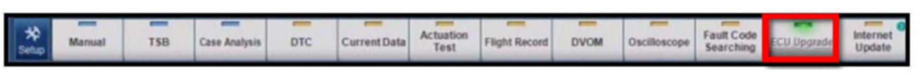 6. Once back at the GDS Main Screen, select ECU Upgrade from the bottom right-hand corner. Next select Auto Mode, and then Engine. Perform the ECM upgrade in accordance with normal GDS tool ECM upgrade procedures.
