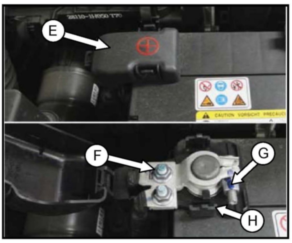 Loosen the Positive (+) battery cable terminal nut (G) and remove the Positive (+) battery cable terminal plate (H) from the Positive (+) battery terminal.
