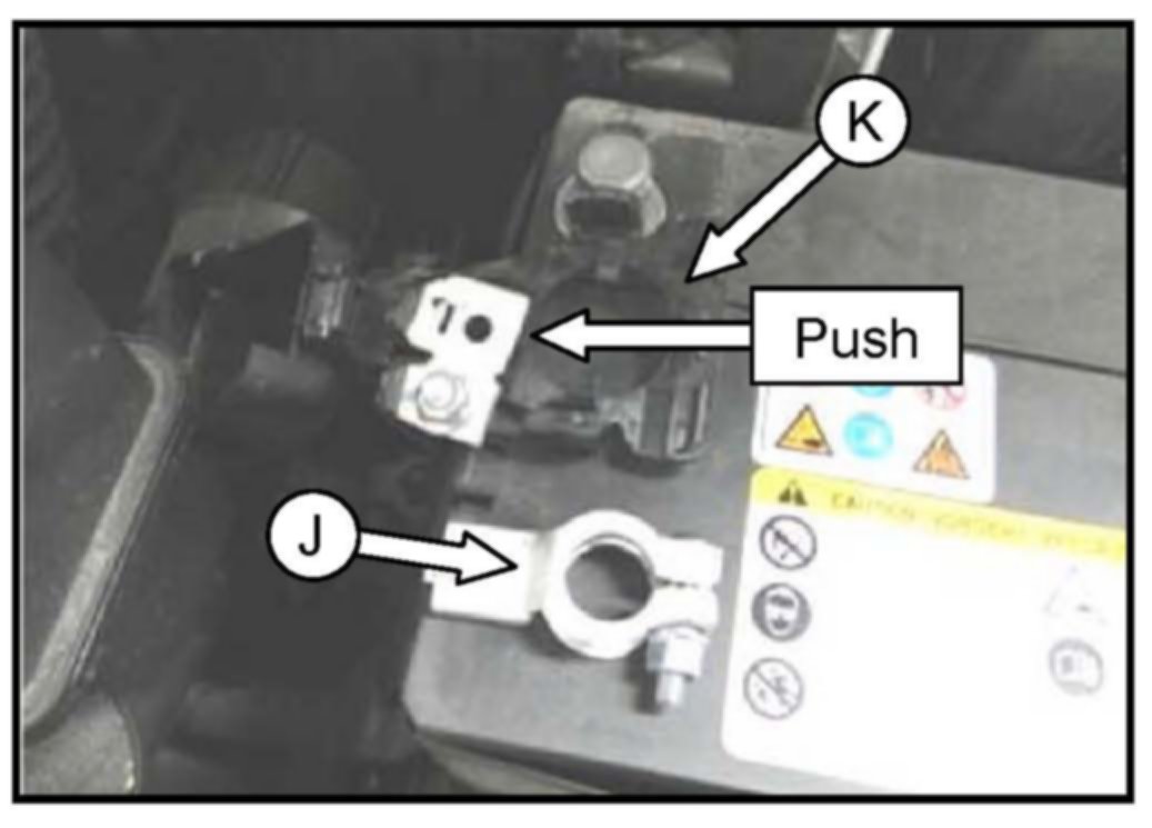 6. Separate the Positive (+) battery cable terminal (J) from the Positive (+) battery cable terminal plate (K) by pushing it in the direction of the arrow.