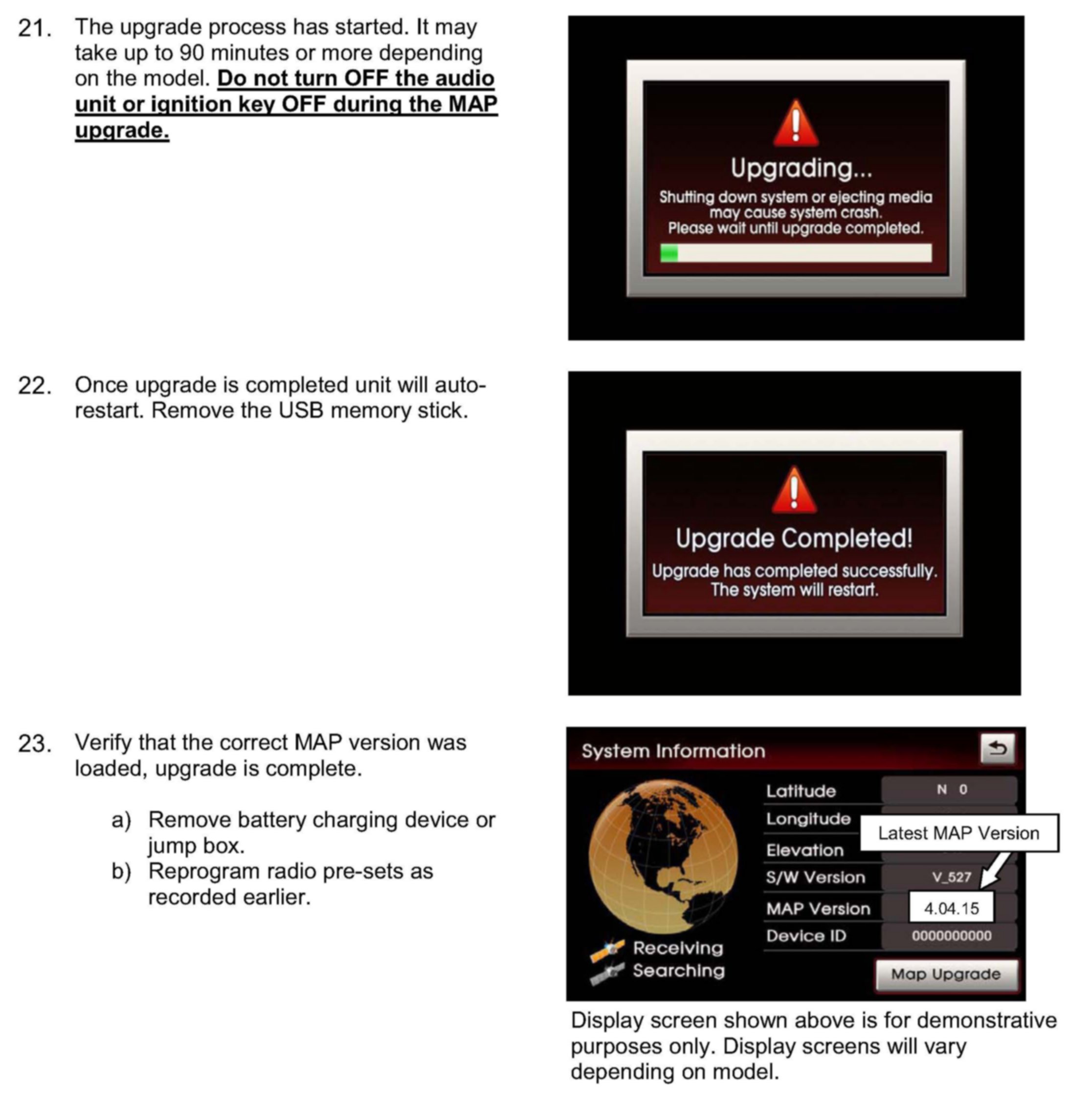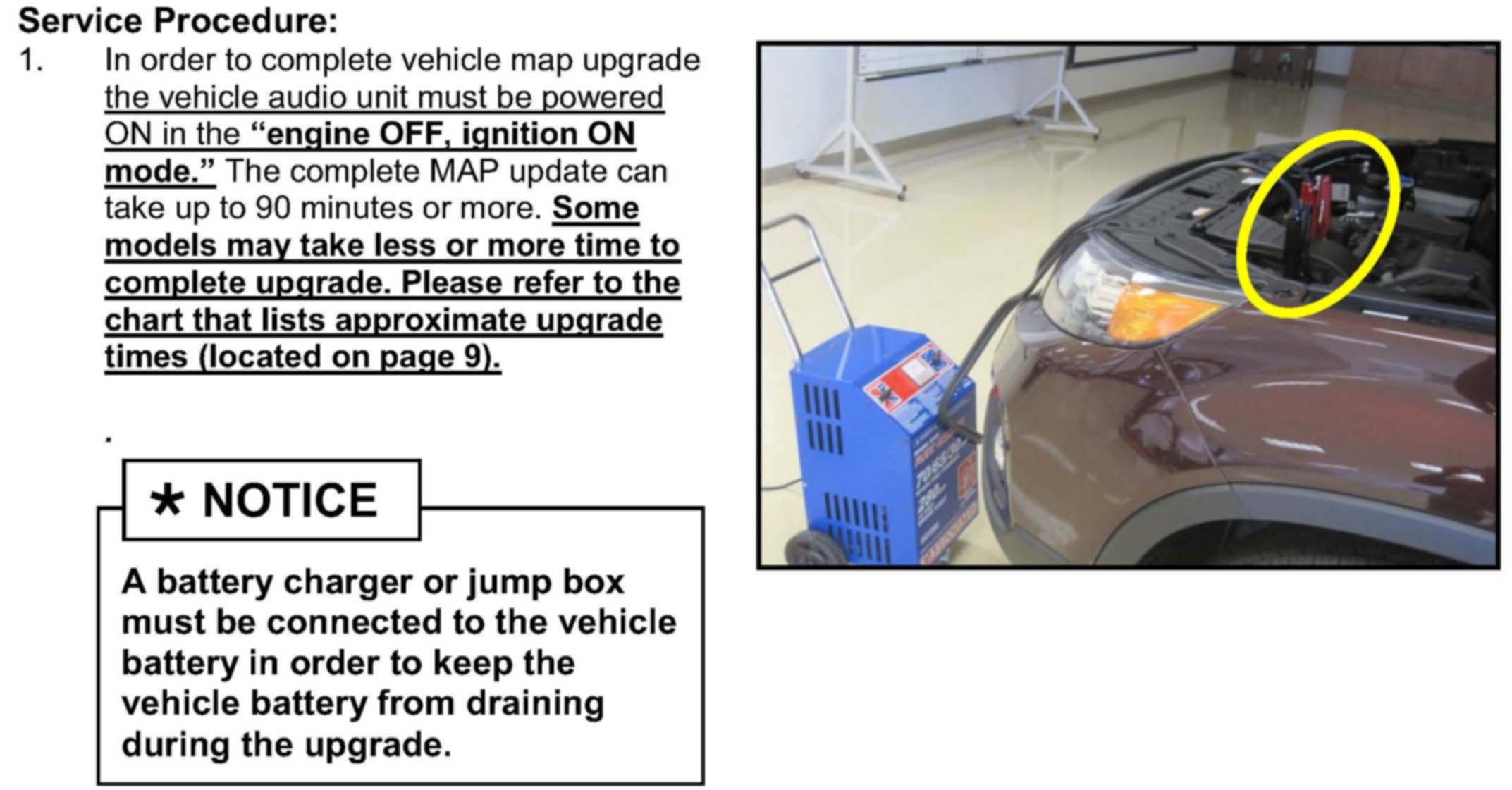 DO NOT start and leave vehicle idling unattended during Map Software upgrade, instead use a battery charger or similar device during upgrade procedure.