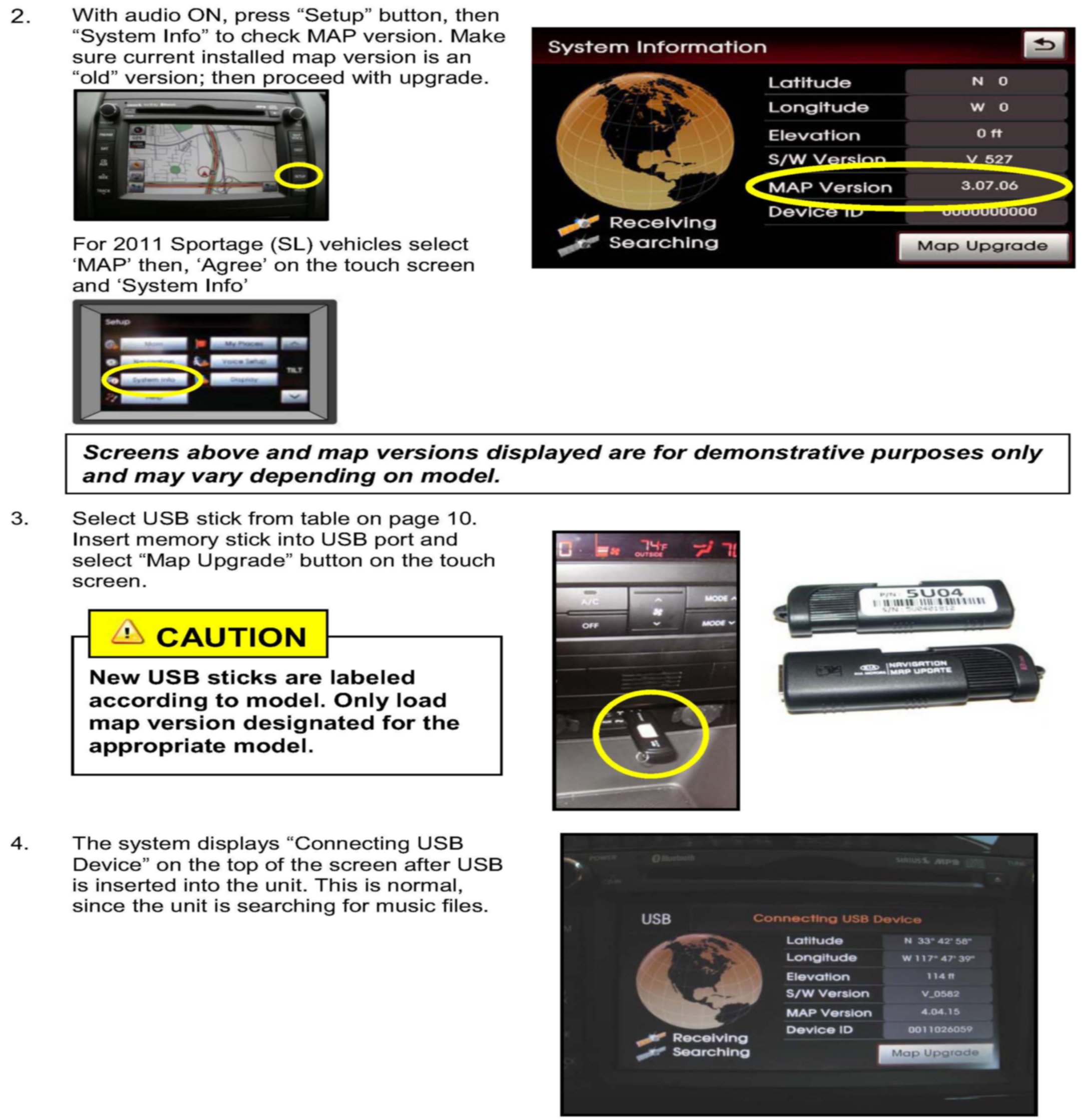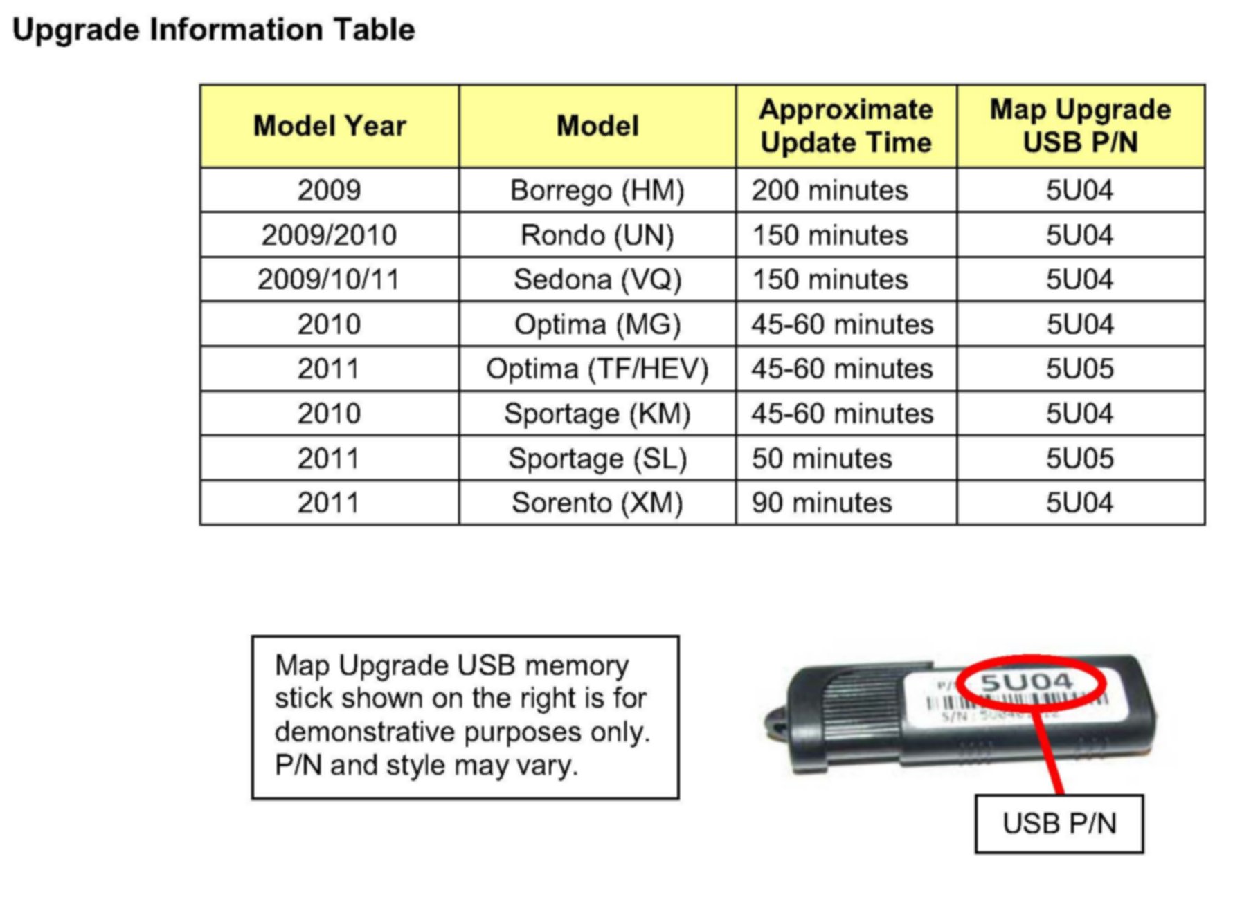 This bulletin provides information for certain Kia models equipped with a factory Kia navigation system. Kia owners will have the option to purchase a map upgrade directly from MnSoft (a Kia approved supplier) and can perform the upgrade themselves or have the dealer perform the upgrade in which case additional labor charges will apply. For customers who perform their own upgrade, MnSoft will provide the customer with map software and upgrade instructions. The Map Upgrade Program launch POP (Point of Purchase) material is being supplied to dealers and will provide complete information and will include 2 USB memory sticks pre-loaded with current maps.
