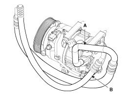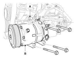 6. Disconnect the compressor connector (A), and then remove mounting bolts and the compressor (B).
