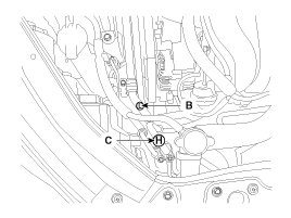 Recovery/Recycling/Charging System (A) to the high-pressure service port (B) and the low-pressure service port (C) as shown, following the equipment manufacturer's instructions.