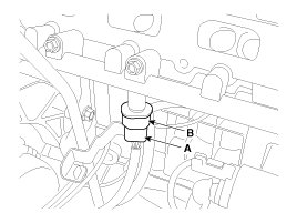 4. Disconnect the rail pressure sensor connector (A), and then remove the sensor (B) from the delivery pipe.