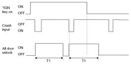 Crash Door Unlock1. FOB IN ON or KEY IN ON or ACC ON or IGN1 ON or IGN2 ON state Crash Input ON signal is ON, T1 is performed for ALL DOOR UNLOCK output. (CRASH UNLOCK output)