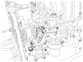 2. Disconnect the A/C compressor switch connector (A) the alternator connector (B), and the cable from alternator "B" terminal (C).
