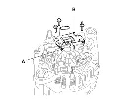 2. Remove the slip ring guide (A) and then loosen the mounting bolts and disconnect the brush holder assembly (B).