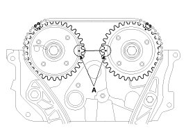 8. After rotating crankshaft 2 revolutions in regular direction (clockwise viewed from front), confirm that the TDC marks (A) on the intake and exhaust CVVT sprockets aligned with the top surface of cylinder head.