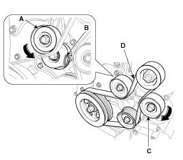 (2) Remove the drive belt (D) after rotating the drive belt #2 tensioner arm (C) clockwise.