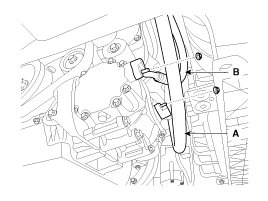 9. Remove the bolts, then disconnect the suction line (A) and discharge line (B) from the compressor.