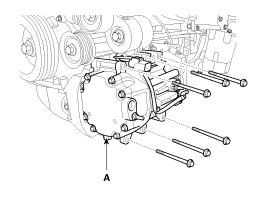 10. Disconnect the compressor low voltage connector and then remove 6 mounting bolts and the compressor(A).