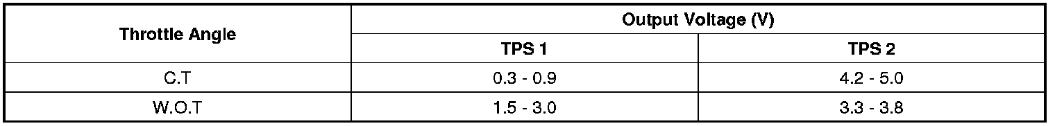 2. Start the engine and measure the output voltage of TPS 1 and 2 at C.T. and W.O.T.