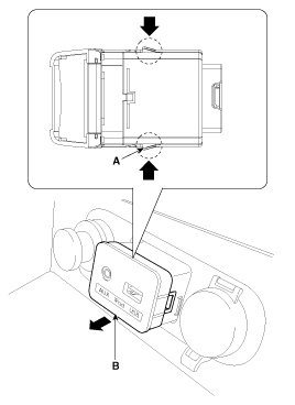 4. Remove the multimedia jack (B) from the console under cover after releasing the fixed hooks (A).