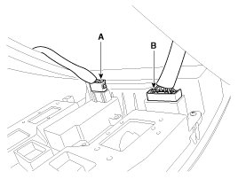 3. Disconnect the connectors of sunroof switch (A) and lamp switch (B) then remove the overhead console lamp assembly.