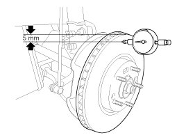 1. Place a dial gauge about 5mm (0.2 in.) from the outer circumference of the brake disc, and measure the runout of the disc.