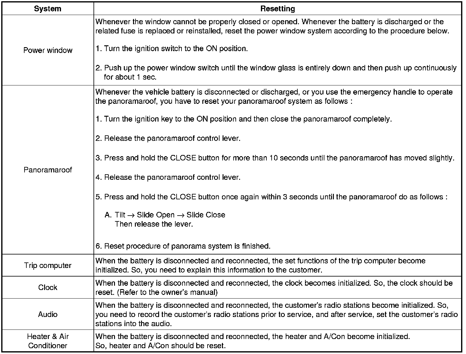 When reconnecting the battery cable after disconnecting, recharging battery after discharged or installing the memory fuse located on the driver's side panel after removing, be sure to reset systems mentioned in the below table.