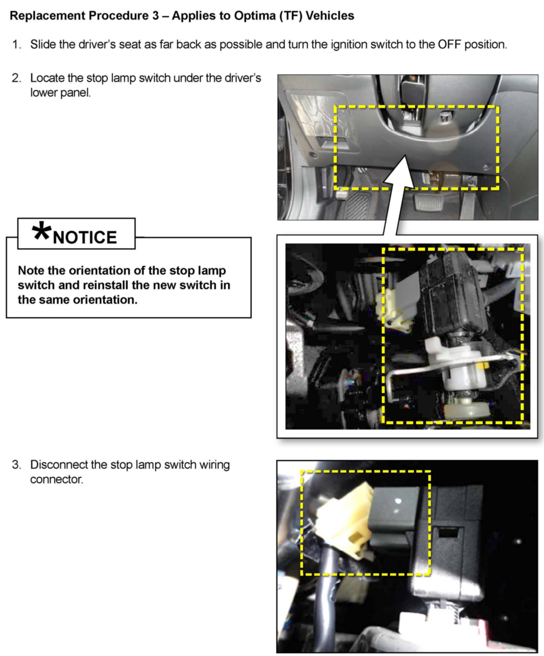 Three (3) replacement procedures using eight (8) different part numbers are covered in this Bulletin. Each procedure covers specific vehicle models and stop lamp switch parts.