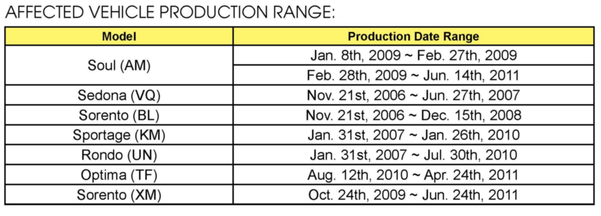 AFFECTED VEHICLE PRODUCTION RANGE