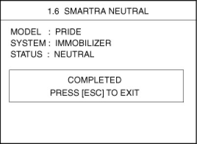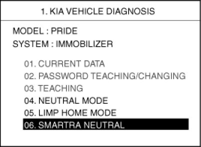 This function is for neutralizing the PCM(ECM) and Key. Ex) when lost key, Neutralize the PCM(ECM) then teach keys. can be set to the "neutral" status by a scanner.If wrong vehicle specific data have been sent to SMARTRA three times continuously or intermittently, the SMARTRA will reject the request to enter neutral mode for one hour. Disconnecting the battery or other manipulation cannot reduce this time. After connecting the battery the timer starts again for one hour.