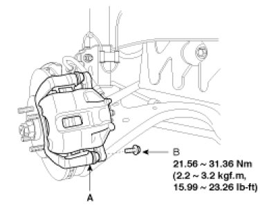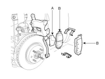 1. Remove guide rod bolt(B) and raise the caliper (A).Check the hoses and pin boots for damage and deterioration.