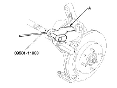 4. Push in the piston (A) using the SST(09581-11000) so that the caliper will fit over the pads. Make sure that the piston boot is in position to prevent damaging it when pivoting the caliper down.