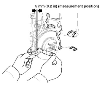 1. Place a dial gauge about 5mm (0.2 in) from the outer circumference of the brake disc, and measure the run out of the disc.
