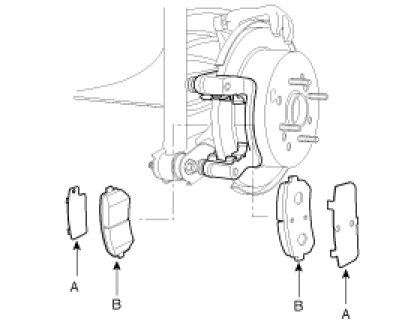 2. Check the foreign material at the pad shim (A) and the back of the pads (B).