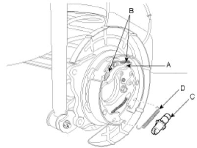 4. After installing the strut(C) and upper return spring(D), install the adjuster assembly(B) and the lower return spring(C).