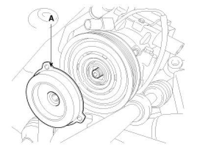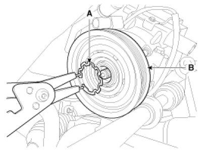 - Be careful not to damage the pulley (B) and compressor during removal/installation.