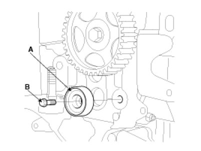 5. Install the idler pulley(A) and tighten the bolt(B) to the specified torque.