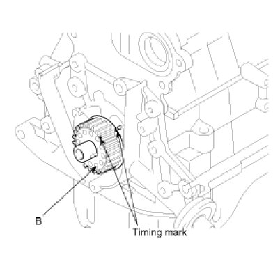 4. Align the timing marks of the camshaft sprocket(A) and crankshaft sprocket(B) with the No.1 piston placed at top dead center and its compression stroke.