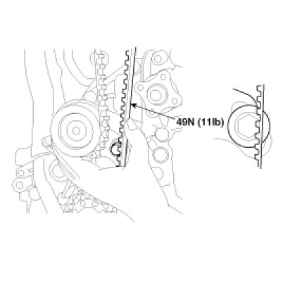 Verify that when the tensioner and the tension side of the timing belt are pushed in horizontally with a moderate force [approx. 49N (11lb)], the timing belt cog end is approx. 1/2 of the tensioner mounting bolt head radius (across flats) away from the bolt head center.