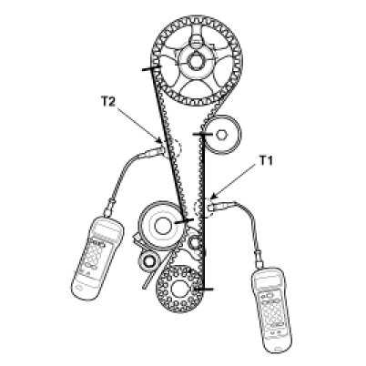 Rotate crankshaft in clockwise direction to set 1st piston on top dead center (TDC) and rotate crankshaft in counterclockwise to 90° then measure the belt tension in the middle of tension side span (in both arrow direction of above illustration ) by free vibration method.