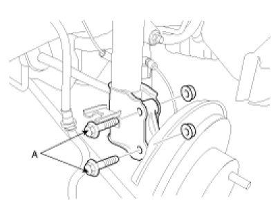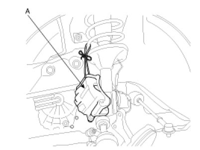 19. Remove the front caliper(A) and use a wire to secure the caliper to the vehicle so that it is out of the way.