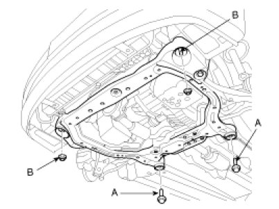 24. Remove the sub-frame bolt(A) and nut(B).