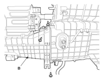 4. Remove the bolts (A) and the expansion valve (B) from the evaporator core.