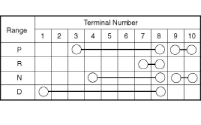 9. If there is not continuity between the terminals in the table above for each switch position, replace the inhibitor switch.