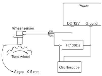 In order to protect the wheel speed sensor, when measuring output voltage, a 100 Ohms resister must be used as shown.