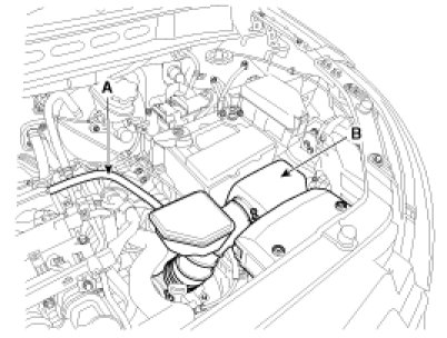 2. Disconnect the breather hose (A) and then, remove the air cleaner assembly (B).