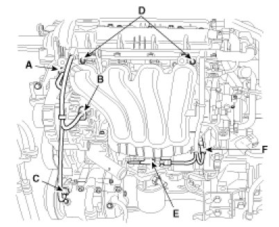 (8) Remove the knock sensor bracket (E) and disconnect MAP sensor connector (F).