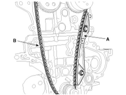 22. Remove the timing chain tensioner arm(A) and guide(B).
